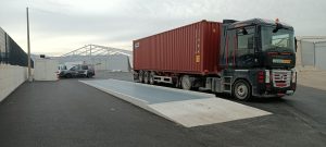 Mostna tehtnica s kovinskim sprejemnikom bremena a z betoniranimi navozi, ki je strateško postavljena na vhod v podjetje, da lahko spremljajo vhod/izhod tovora in surovin.
